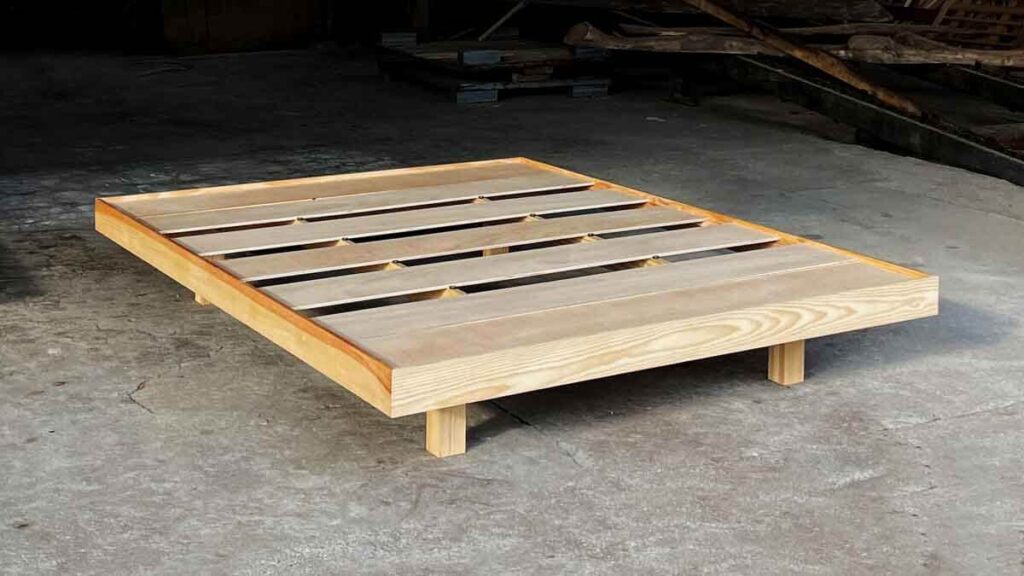 cama minimalista com estrutura sólida em madeira. pronta para desportos coletivos.